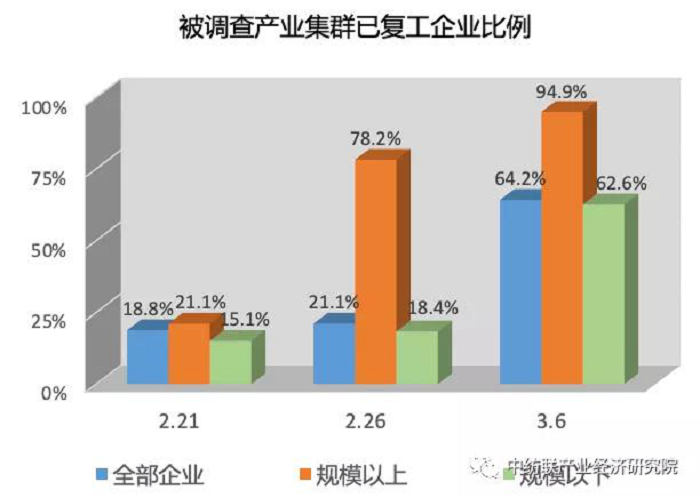 小微企业复工复产情况好转。28个重点产业集群内共有4.5万户规模以下企业实现复工,占集群规下企业总数的比例达到62.6%,较上周调查数据提高了40多个百分点;规下企业已复工人数达到62.6万人,占正常情况用工人数比例为48.4%。但与集群规模以上企业相比较,小微企业复工进度仍然相对偏慢。