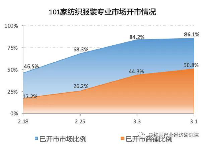 专业市场开市复工进一步推进。根据中纺联流通分会3月10日对全国101家重点纺织服装专业市场的调查数据,单体市场开市率已经达到86.1%,比前一周调查时提高1.9个百分点;已开市商铺数为7.2万个,占正常情况下市场商铺总数的比例为50.8%,较一周前提高了6.5个百分点,过半商铺已经恢复营业。